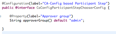 When you run this code, it will try to lookup the config property “approverGroup” (which is derived from the field name in CaConfigurationParticipantStepChooserConfig), but it returns the default value “admin”, as we haven’t provided any configuration value yet.
