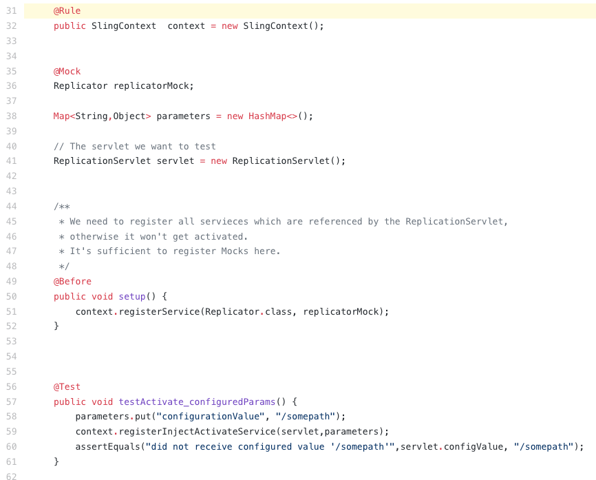 With SlingMocks the approach changes. I am not required to create mocks, but SlingMocks provides a mocked OSGI runtime we can use. That means, that we create the OSGI parameters as a map to tell the SlingContext object to register our service with these parameters (line 59).