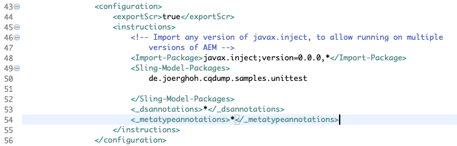 Also you need to instruct the maven-bundle-plugin to actually export the generated metadata to the filesystem using the “<exportScr> statements; this should be the default in my opinion, but you need to specify it explicitly. Also don’t forget to add the “_dsannotation” and “_metatypeannotations” statements to its instruction section: