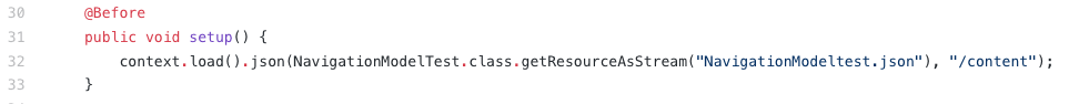The setup method is very simple: It loads a JSON structure and populates a in-memory resource tree with it (adds everything below a resource “/content”). Using this approach there’s no longer the need to mock resources, properties/value maps, and mock the relation between these. This is all done by the SlingMocks/AemMocks framework.