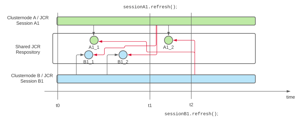 We have 2 sessions A1 and B1 which are initiated at the same time t0, and which perform changes independently of each other on the repository, so session B1 cannot see the changes performed with A1_1 (and vice versa). At time t1 session A1 is refreshed, and now it can see the changes B1_1 and B1_2. And afterwards B1 is refreshed as well, and can now see the changes A1_1 and A1_2 as well.