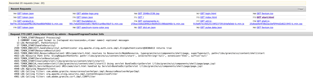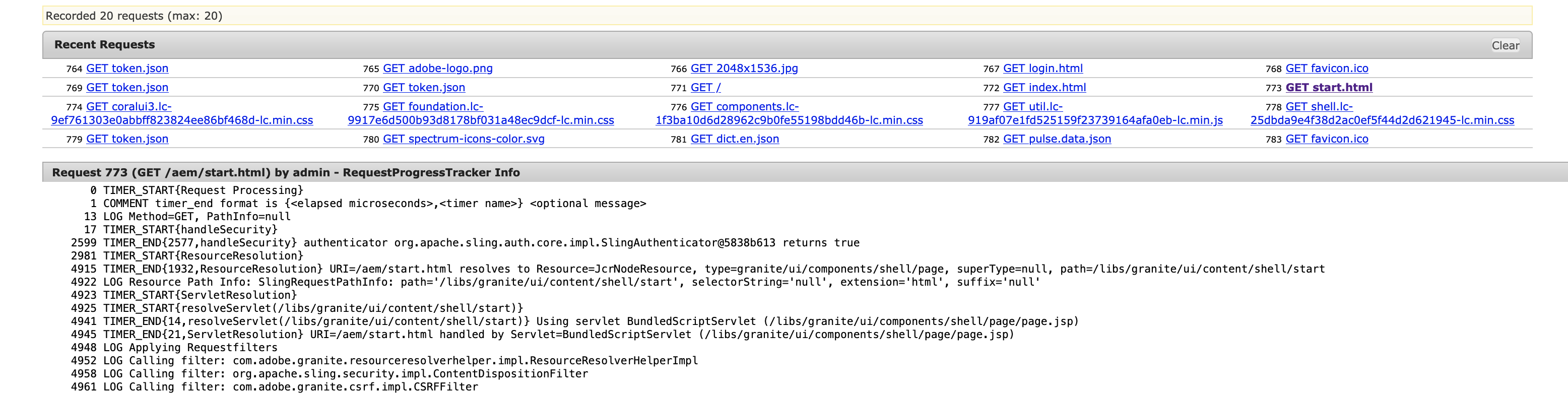 The Request Progress Tracker plus the “Recent Requests” Screen of the OSGI webconsole are a really cool combination to both help you to understand the inner working of the Sling Request Processing, and it’s also a huge help to analyze and understand the performance of request processing.